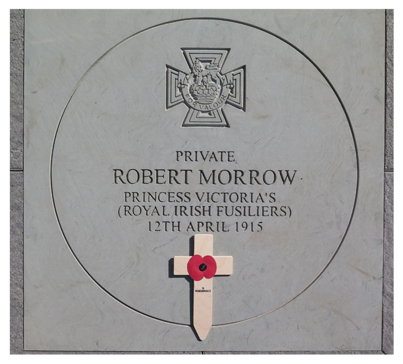 The ceremony included the unveiling of Private Robert Morrow V.C.'s Commemorative Paving Stone. The Stone lies next to the Robert Morrow Memorial in Newmills. A specially commissioned "Unveiling Cloth" covered the commemorative stone.